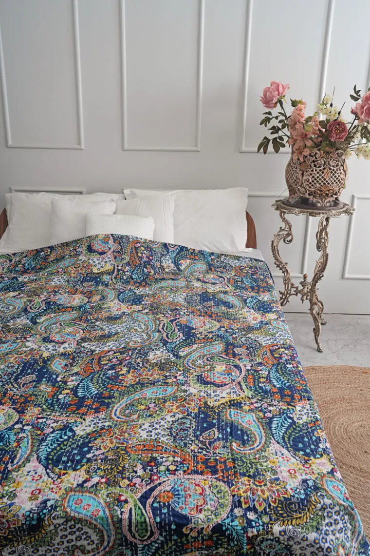 Indulge in the exquisite artisanship of our Kantha quilt, meticulously handcrafted using the finest organic cotton. Adorned with a captivating traditional Indian design and a resplendent floral print, this quilt is a true feast for the eyes. Its reversible feature adds a touch of practicality, allowing you to refresh your space with ease. Elevate the ambience of your bedroom with this one-of-a-kind, handmade masterpiece.